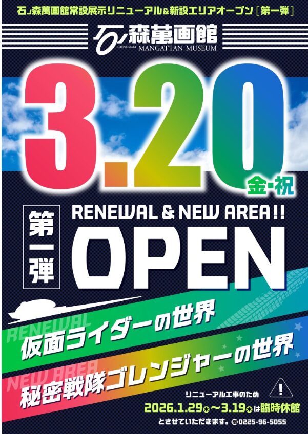 常設展示リニューアルと新設エリアがオープンします。仮面ライダーの世界や秘密戦隊ゴレンジャーの世界を体験できます。
