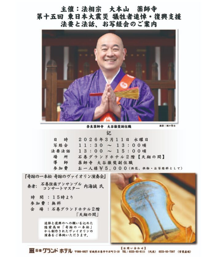 写経会、法要法話に引き続き15時から石巻弦楽アンサンブルコンサートマスター 内海 誠氏による「奇跡の一本松 奇跡のヴァイオリン演奏会」が行われます(参加費無料)