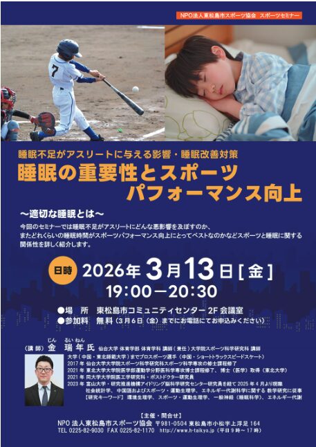 今回のセミナーでは睡眠不足がアスリートにどんな悪影響を及ぼすのか、またどれくらいの睡眠時間がスポーツパフォーマンス向上にとってベストなのかなどスポーツと睡眠に関する関係性を詳しく紹介します。