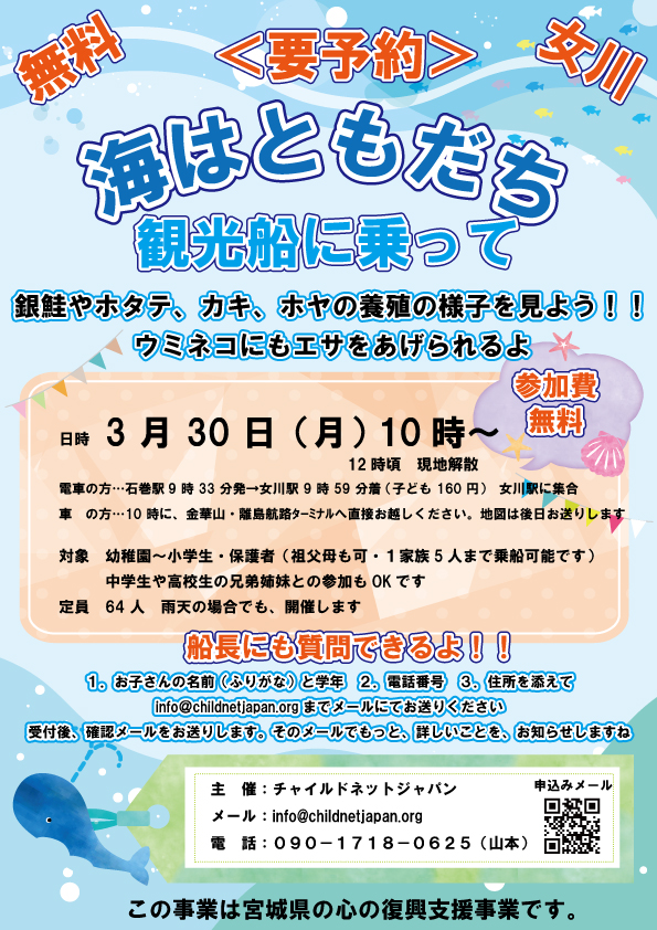 「海はともだち 観光船に乗って2026」は、2026年3月30日に女川金華山・離島航路フェリー乗り場で開催される特別なイベントです。この日は、海の魅力を存分に楽しむチャンスです!観光船に乗って、雄大な自然や美しい景色を眺めながら、養殖の現場を巡り、船長への質問タイムもありの素敵なひとときを体験できます。参加費は無料なので、気軽にご参加ください。家族や友人と一緒に、新しい冒険を楽しむ絶好の機会です。新鮮な海の風を感じながら、春休みの特別な思い出を作りましょう。皆さまのお越しを心よりお待ちしています!