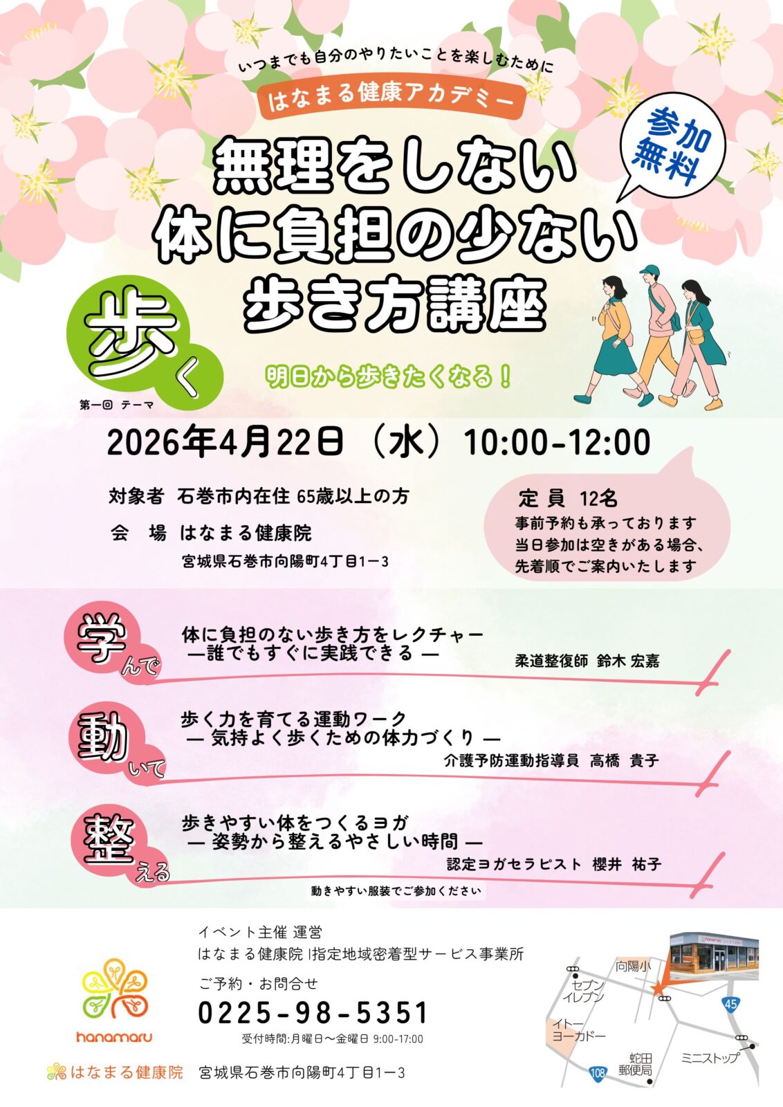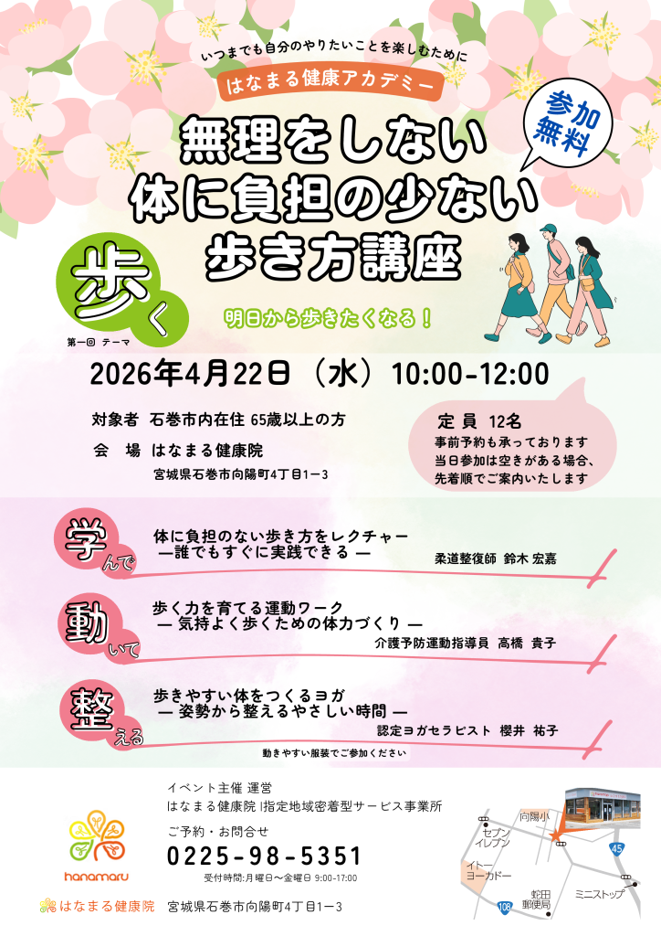 「はなまる健康アカデミー」で開催される「無理をしない体にふたんの少ない歩き方講座」にぜひご参加ください!あなたの歩き方を見直し、心地よい体を手に入れるチャンスです。2026年4月22日、はなまる健康院で行います。