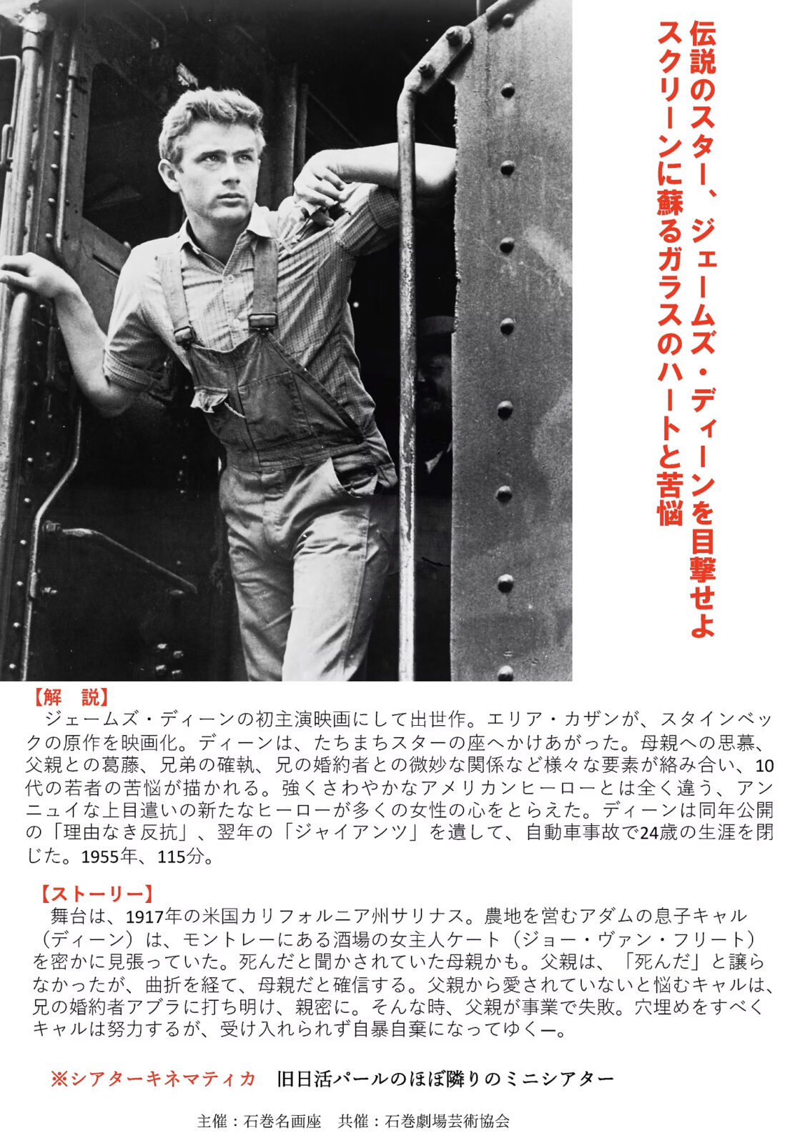 石巻名画座vol.19は、ジェームズ・ディーンの初主演映画にして出世作『エデンの東』。エリア・カザンが、スタインベックの原作を映画化。ディーンは、たちまちスターの座へかけあがった。母親への思慕、父親との葛藤、兄弟の確執、兄の婚約者との微妙な関係など様々な要素が絡み合い、10代の若者の苦悩が描かれる。強くさわやかなアメリカンヒーローとは全く違う、アンニュイな上目遣いの新たなヒーローが多くの女性の心をとらえた。