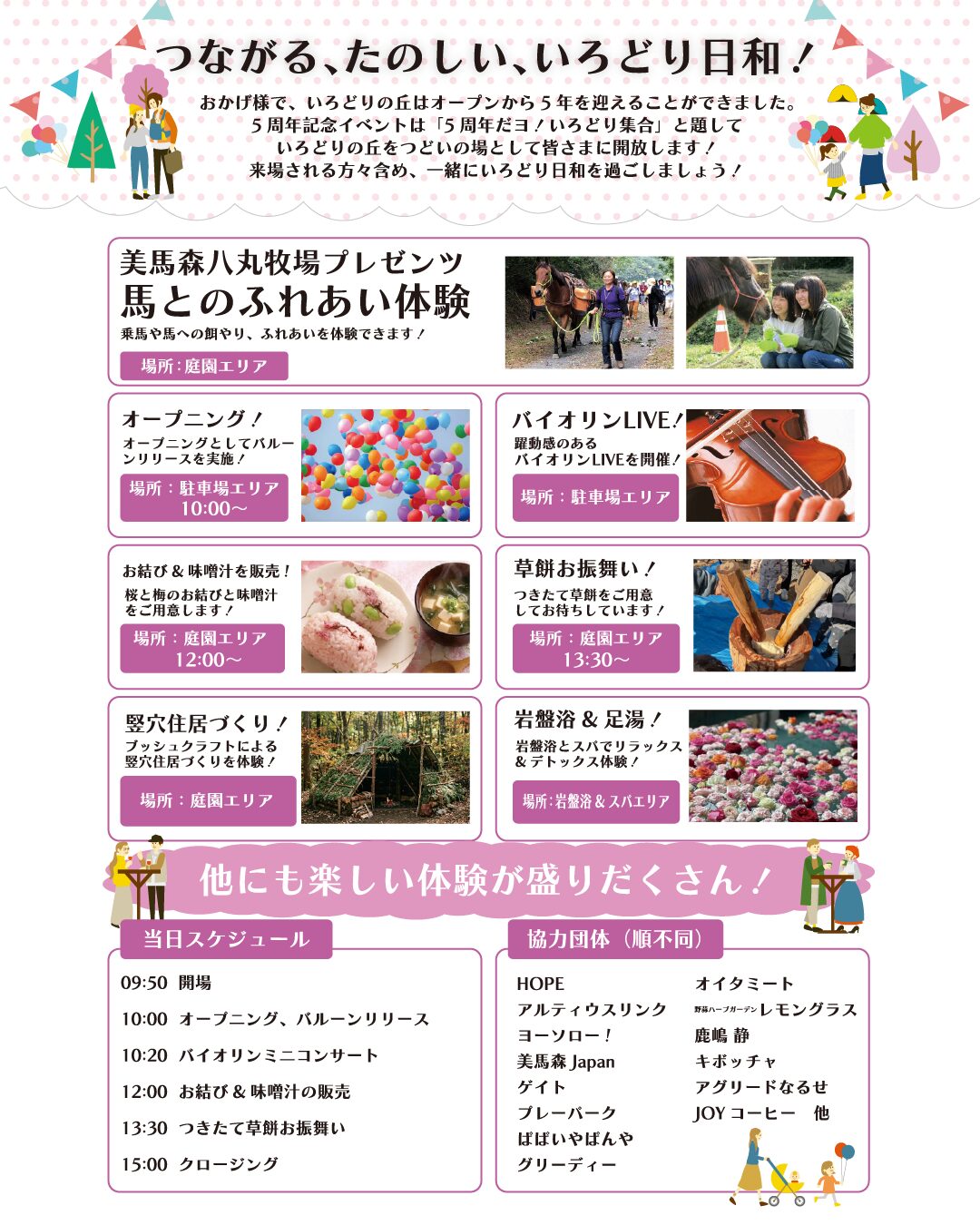 「5周年だョ!いろどり集合」は、地域の皆さんに愛され続けるいろどりの丘で開催されます。この特別な日を祝うために、さまざまな楽しい催しが用意されています。地元の特産品やワークショップ、馬との触れ合いや縄文暮らし体験など、楽しめるコンテンツが満載です。