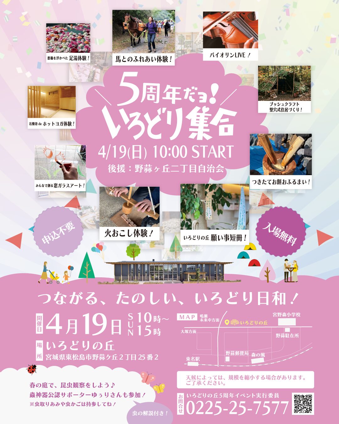 家族や友達と一緒に、賑やかな雰囲気を楽しみながら、地域の魅力を再発見する絶好の機会です。5年間の感謝を込めて、心温まるひとときを過ごしませんか?ぜひ、皆さんお誘いあわせの上、いろどりの丘にお越しください。お待ちしております!