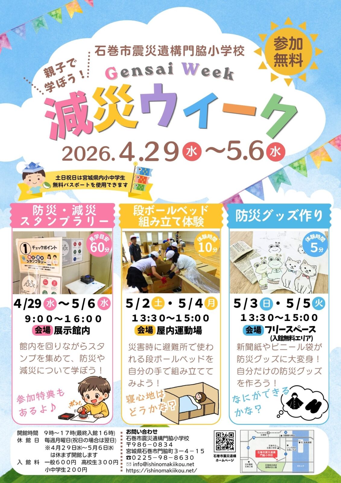 震災遺構門脇小学校では、ゴールデンウイーク期間(4/29~5/6)に親子で防災・減災を学ぶことができる体験会を行います。全て事前申し込み不要です。