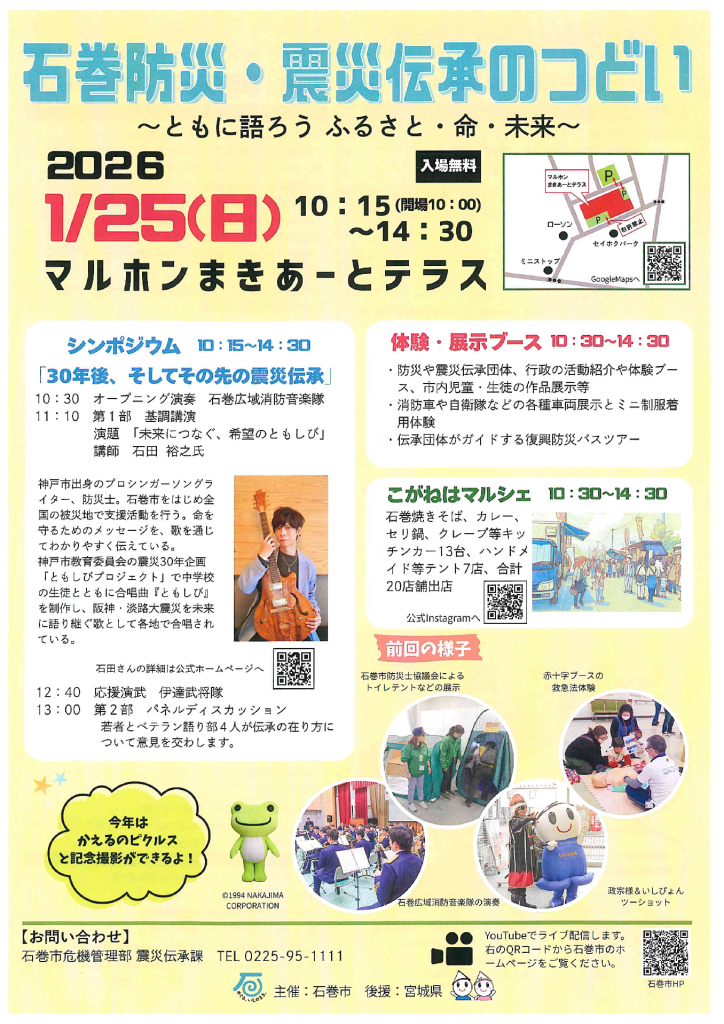 当日は、パネルディスカッション、各種体験・展示ブース、また、石巻広域消防音楽隊の演奏や伊達武将隊の演武、キッチンカーなどがイベントを盛り上げます。